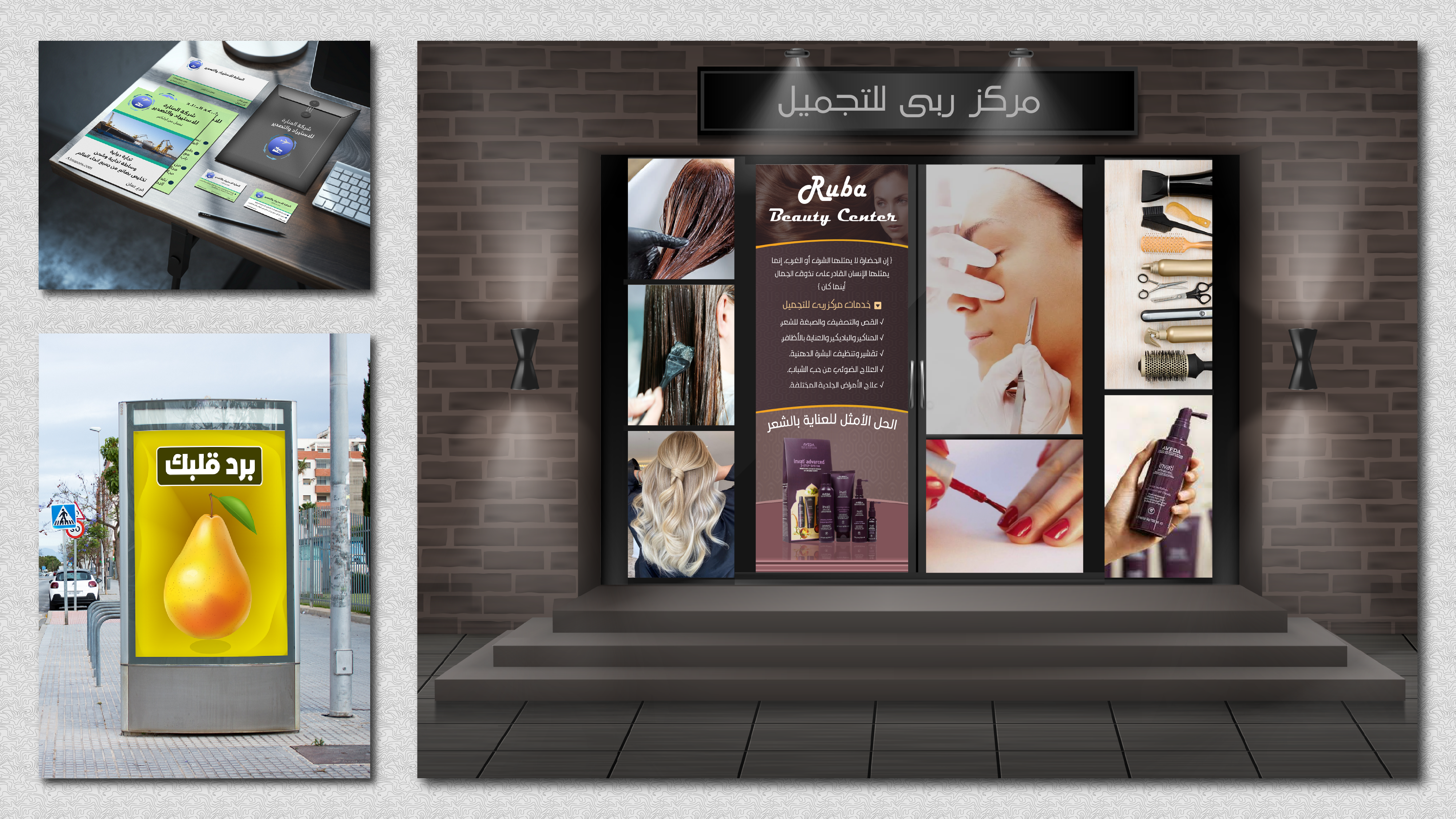 تصميم واجهات الأبواب (ثمانية واجهات) بطريقة متناسقة لصالح مركز ربى للتجميل، كروت عمل ومطبوعات رسمية لصالح شركة المنارة، لوحة إعلانية لعصير المانجا.