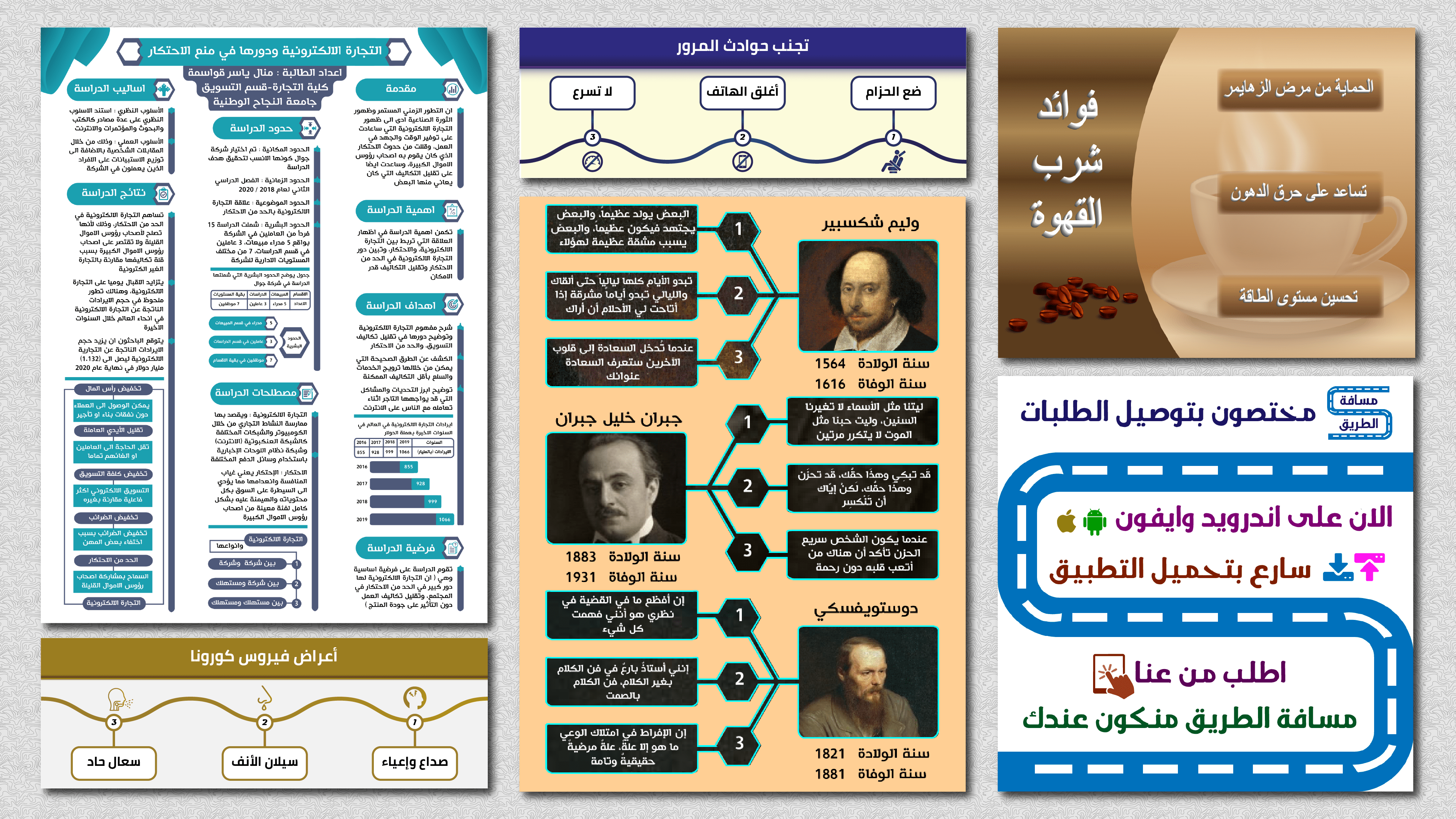 توضيح فوائد القهوة، نصائح لتجنب حوادث المرور، بحث عن التجارة الإلكترونية ودورها في منع الإحتكار، تطبيق مسافة الطريق للتوصيل، أعراض كورونا.