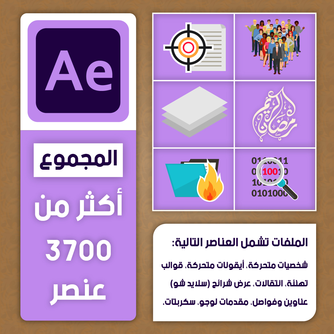 • أكثر من 1500 أيقونة متحركة في 8 ملفات افتر افكت، جميع أشكال الأيقونات، منها شخصيات كرتونية.