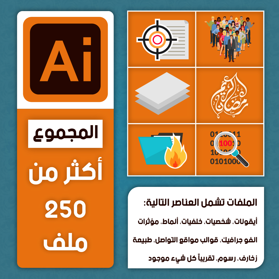 - مجموعة كبيرة من ملفات الفيكتور بصيغة قابلة للتعديل، منها أيقونات وشخصيات كرتونية وخلفيات وزخارف إسلامية.